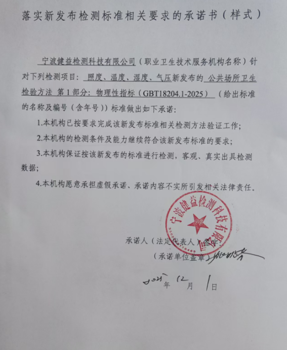 宁波健益检测科技有限公司(职业卫生技术服务机构名称)针对下列检测项目: 照度、温度、湿度、气压。由原先的标准:公共场所卫生检验方法 第1部分:物理因素(GB/T 18204.1-2013)更新为新发布的 公共场所卫生检验方法第1部分:物理性指标(GBT18204.1-2025)